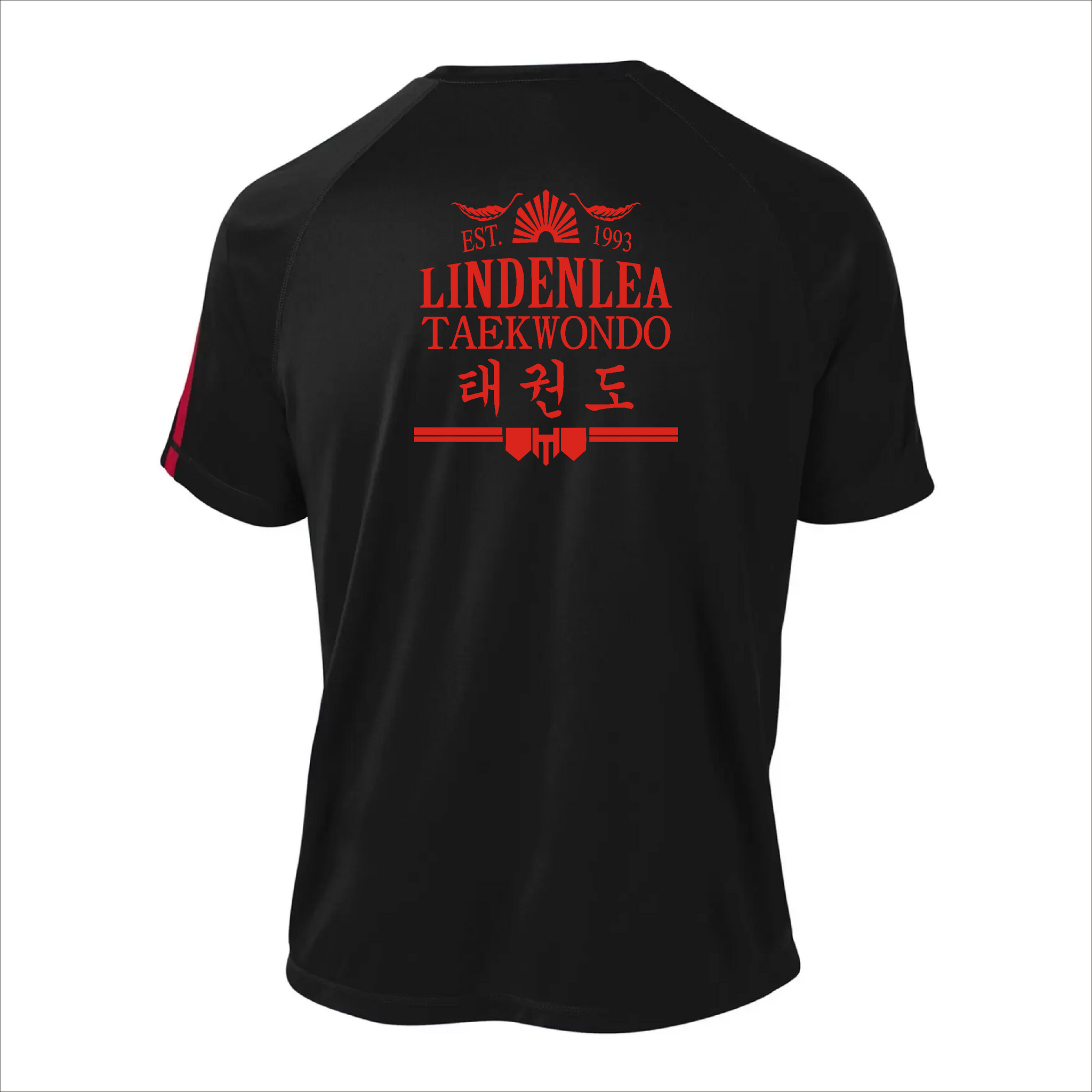 Comes with the Tae E. Lee logo printed on the front left chest and the Lindenlea Taekwondo logo printed on the back of the shirt.