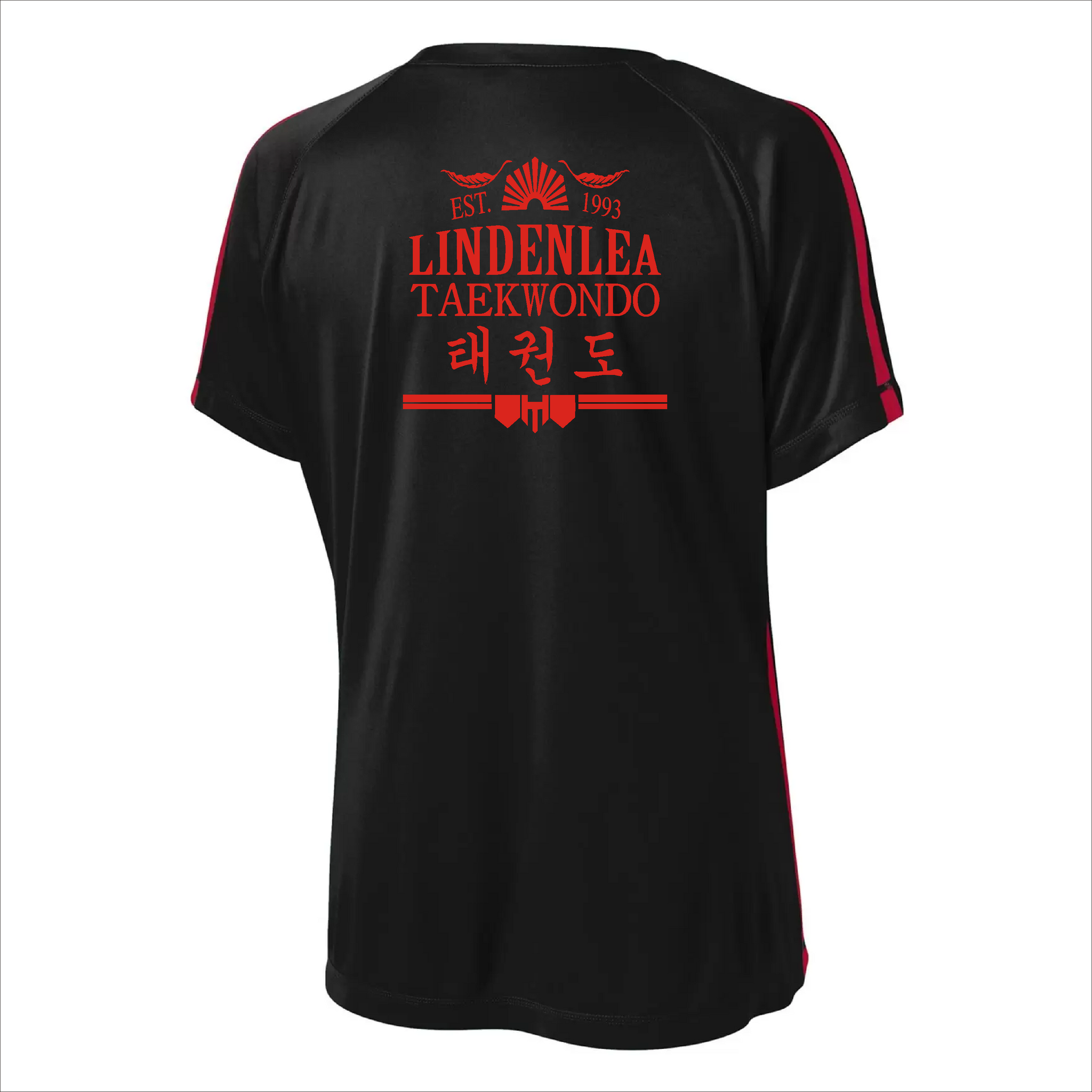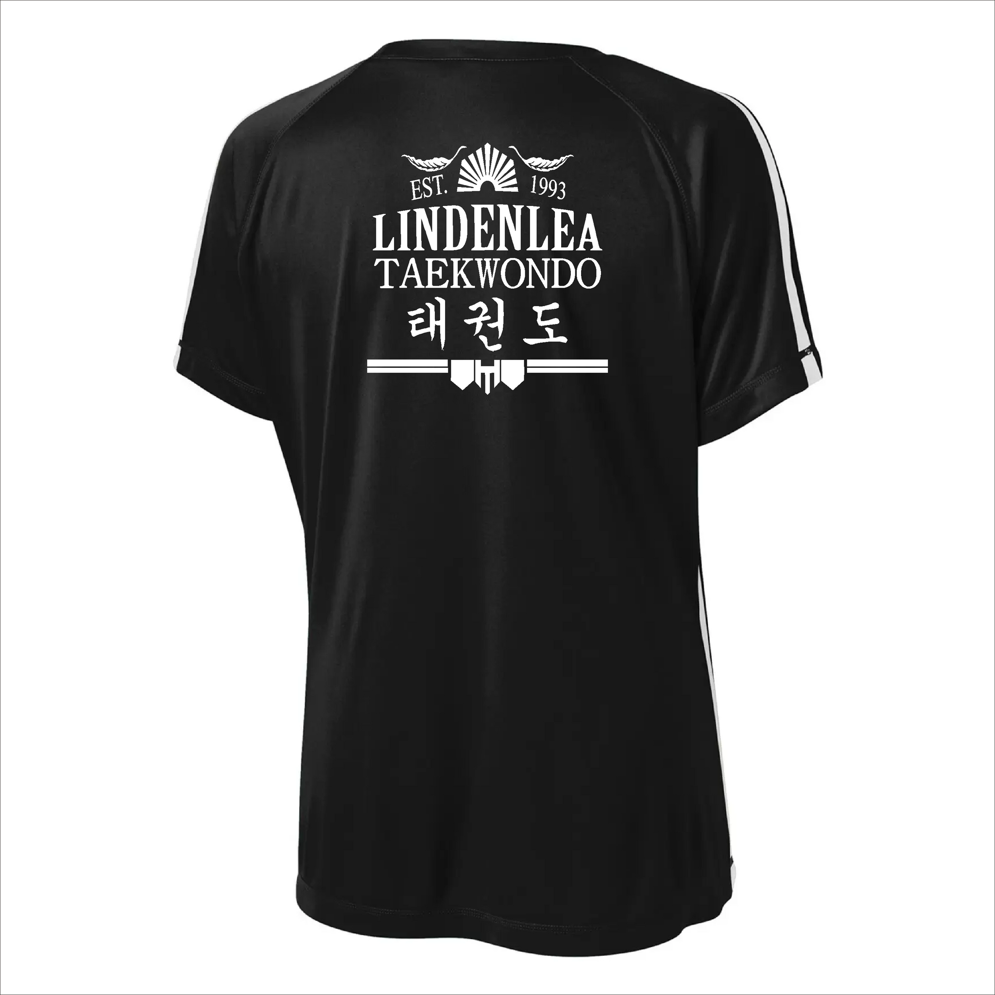 Comes with the Tae E. Lee logo printed on the front left chest and the Lindenlea Taekwondo logo printed on the back of the shirt.