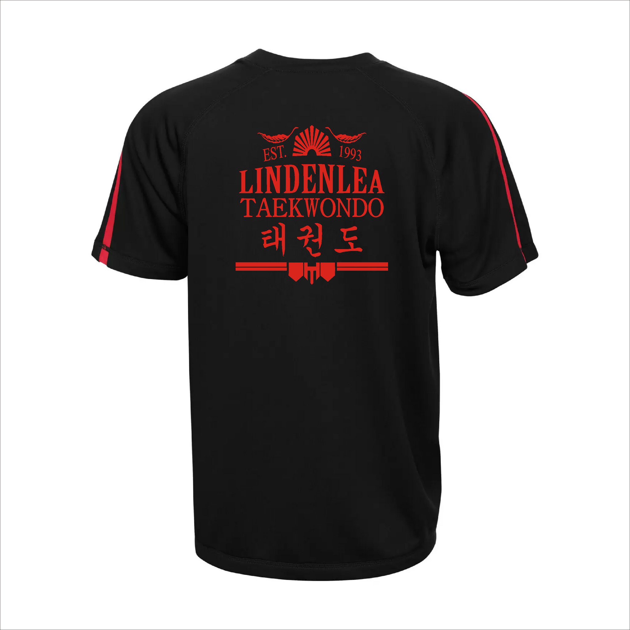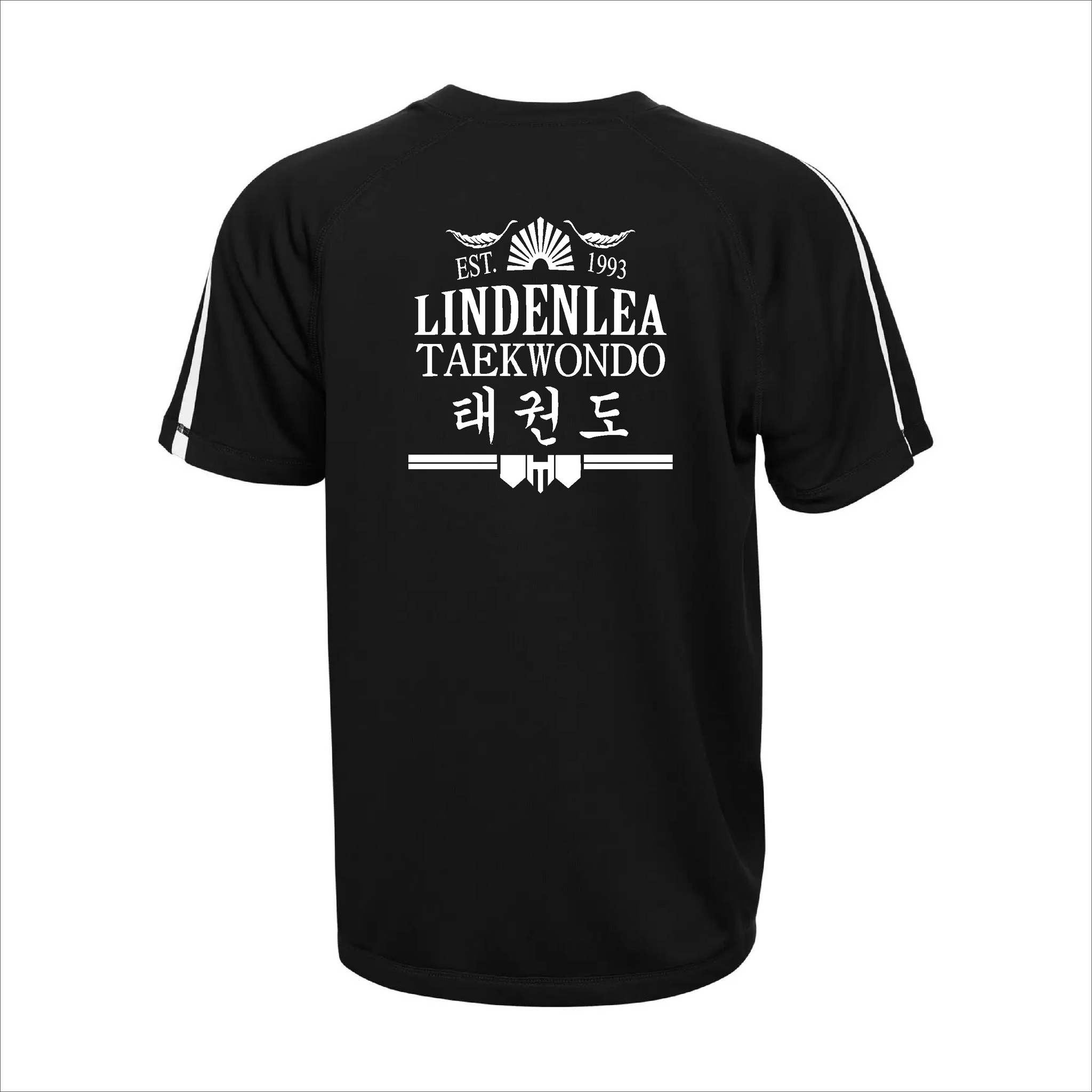Comes with the Tae E. Lee logo printed on the front left chest and the Lindenlea Taekwondo logo printed on the back of the shirt.