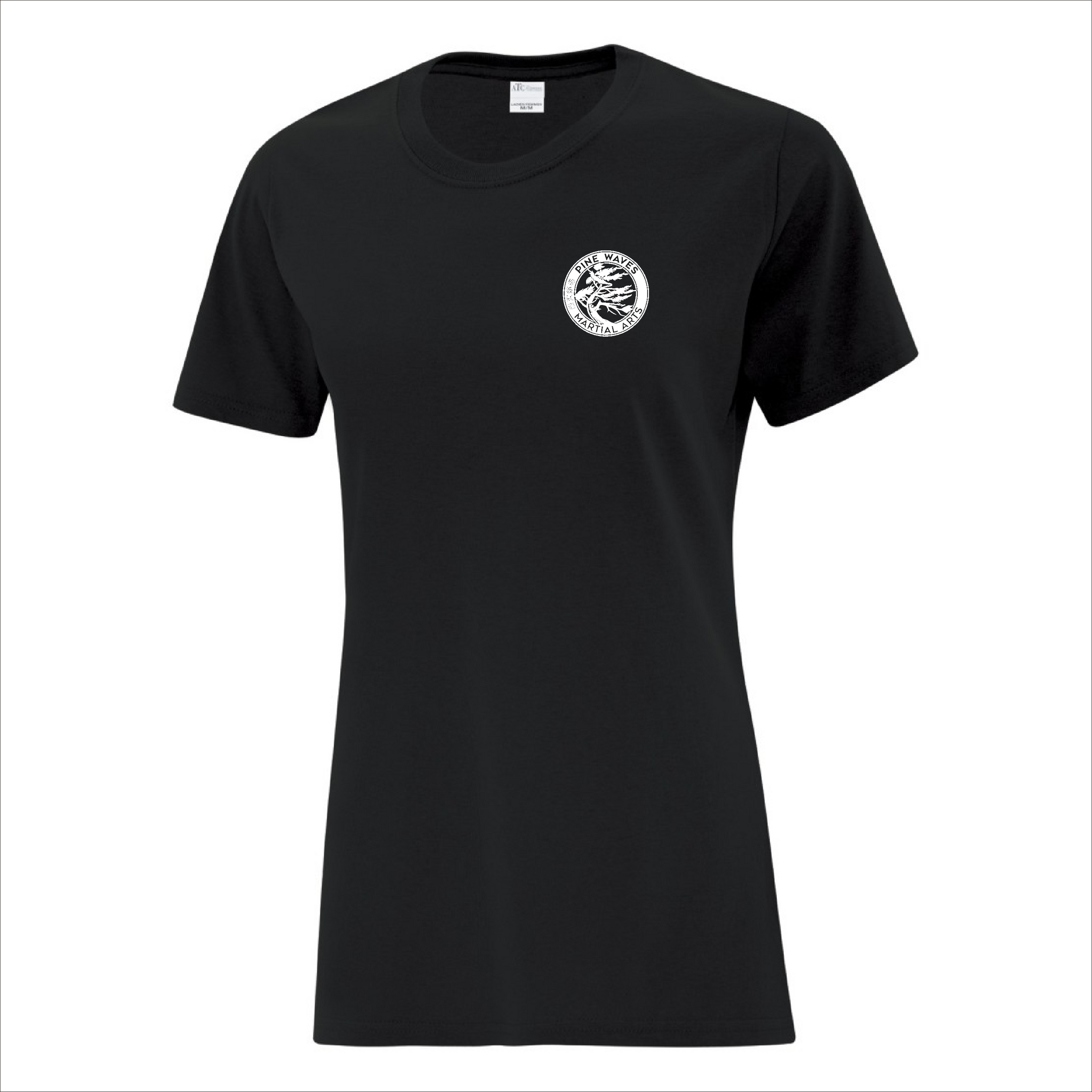 Comes with the Pine Waves Martial Arts logo printed smaller on the front left chest of the shirt, and large on the back.