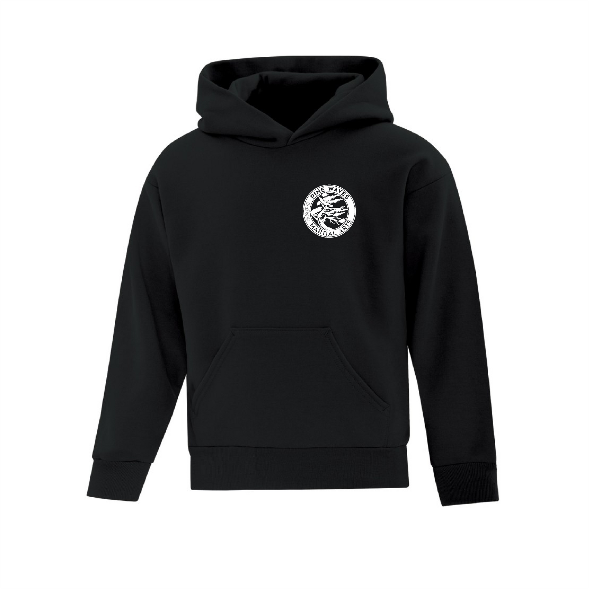 Comes with the Pine Waves Martial Arts logo printed smaller on the front left chest of the shirt, and large on the back.